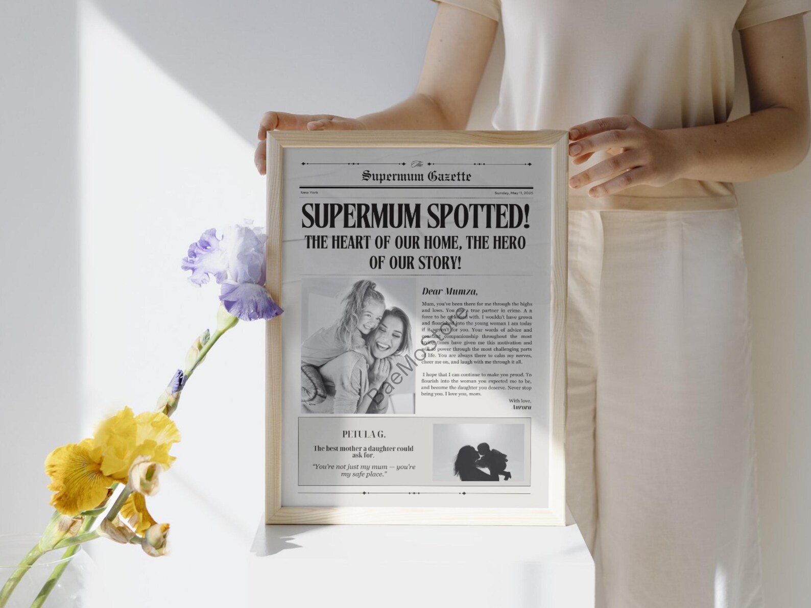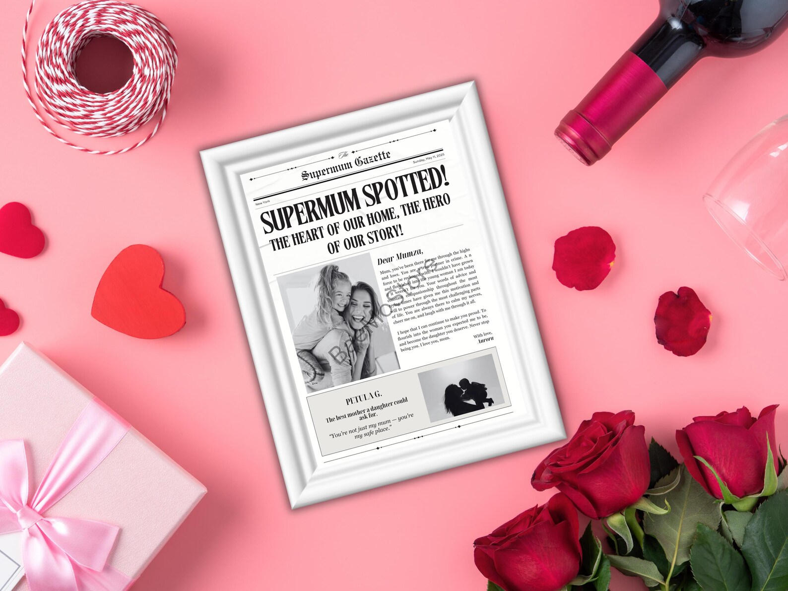 Click on the images to redirect to the Etsy listings for the Physical Print and the Digital Print of our very own Personalized Supermom Gazette Newspaper Card!